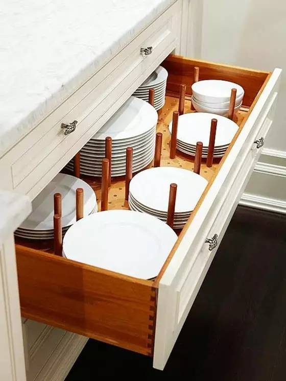 挂在墙上不好打理?在橱柜里,用洞洞板打隔断挂工具,也很方便拿取。