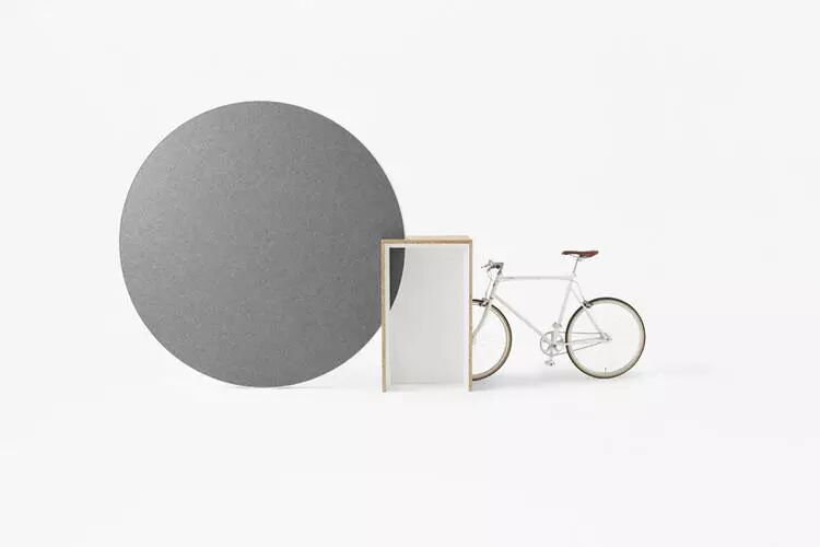 至于如何固定,也不是非得找一面墙靠着。nendo 为这些白板配套设计了带凹槽的桌椅和柜台。这样,白板就可以轻松地被固定进凹槽中。而这些带凹槽的家具,其实还可以被当做自行车停放架。