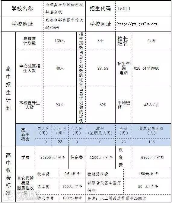 学校简介:同样是是四川嘉祥教育集团,在教学管理上与成都嘉祥外国语学校实行一体化管理。郫县分校位于成都工业学院对面,学生公寓配备中央空调,冬季全天供应热水,每间教室装备电子白板,教学条件一流。