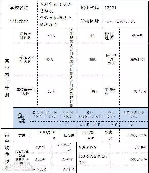 学校简介:成都市盐道街外语学校创建于2002年,设有小学部、中学部,实行小学、初中到高中的十二年一贯寄宿制。而小班化教学则是学校最大特色。去年中考盐外学子的省重点线上线人数比例高达50%,在同级别的民校中名列前茅。