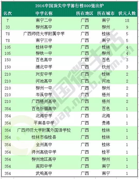 ▲《2016中国顶尖中学排行榜800强》广西上榜名单,数据仅供参考。