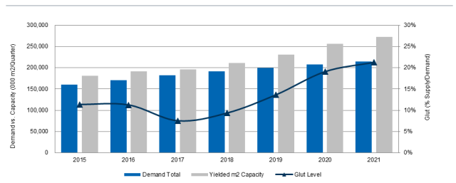 除LGD的P10计划外,富士康/Sharp广州工厂和HKC昆明工厂的计划最近也纳入了IHS的长期产能预测中,概率因数为30%,这意味着五家月产能至少达到90000块基板的新建10.5/11代工厂均处于筹备阶段。如果所有工厂均按预期建成,则新增加的液晶面板产能约为7300万平方米,比2016年增长27%,大屏幕的供需关系将由2017年的供应紧张状况转为2020年的严重过剩。