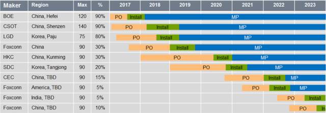 上述工厂的谈判过程比较复杂,需要当地人提供充分的激励政策和各当事方作出折衷妥协。初期业务谈判可能需要三到六个月的时间。一旦谈判完成,就需要向当地管理部门提交详细的项目计划进行审批。这一过程可能需要花费三到六个月。开工后,在设施投入商业性生产前,还需要花费18个月的时间。项目总计需要花费24到30个月。这样的时间进程表明,至少在2019年上半年之前,继京东方和华星光电之后任何新建的10.5/11代工厂均不能开始大规模生产,或许还会延宕至2019年下半年。