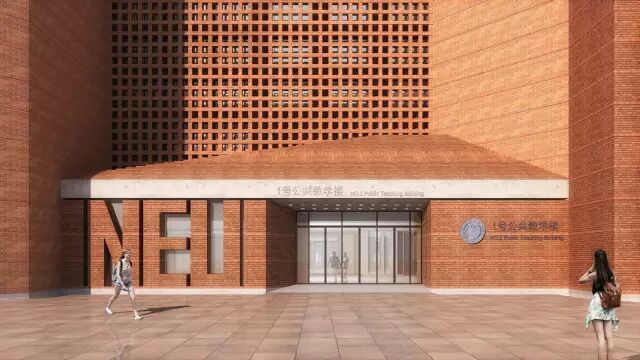 教学馆各门厅及门面设计独具特色。西门厅具有通高的八角形开敞大厅,给人以壮观感,仿佛置身于神圣的殿堂;南门厅具有成排的落地窗采光大厅,给人以现代感;北门厅具有“NEU”标识的红砖砌筑,给人以文化感。
