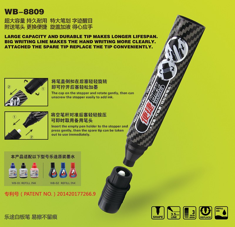 很多朋友在会议中常讲解到一半笔就没了墨水,相当尴尬。为了掌握笔液使用情况。具有视窗的白板笔,窗口对笔液的使用情况一目了然,笔胆更换可以即插即用。