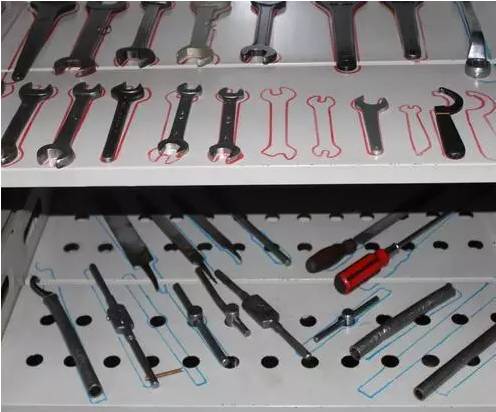 看下图,此工具5S管理,画了工具的行迹,少了工具一眼就能看的出来。此方式有个缺点,工具归位的时候容易放歪,不符合易取易放易管理原则,导致整体不美观。看图就知道了。而且这个图没有标识。