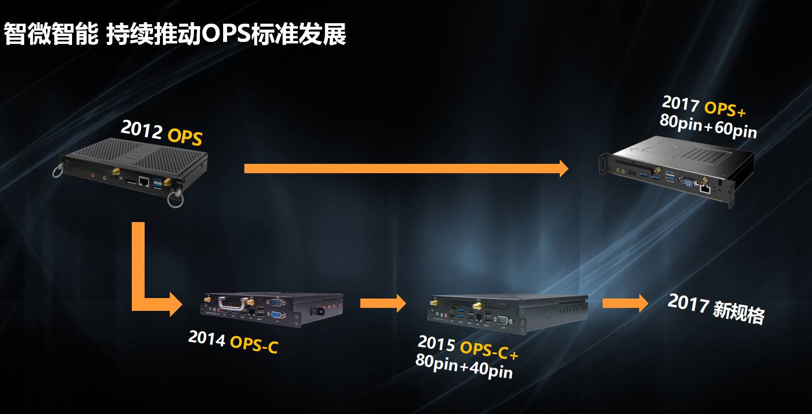 OPS+ 是智微携手 Intel 于 2017 年发布的基于 OPS 优势和强大功能基础之上的新标准。OPS 标准的推出规范了电子白板市场终端控制器的制造,简化了电子白板市场的运维,让电子白板市场得到良性发展,OPS+ 标准改进散热设计,添加最新 Intel 硬件安全性,扩展高效平台,让显示器制造商不论在形式还是性能或者简化架构,节约成本和向后兼容方面比以往任何时候都有更大的灵活性,而 OPS+ 新的扩展性能如支持 8K 极清显示,同时进行视频和广播或是直接集成到显示解决方案中的实时数据分析系统,智微作为行业首家开发 OPS+ 产品的厂商,目的就为使电子白板制造厂商可以通过创新的解决方案满足客户不断增长的复杂新需求。