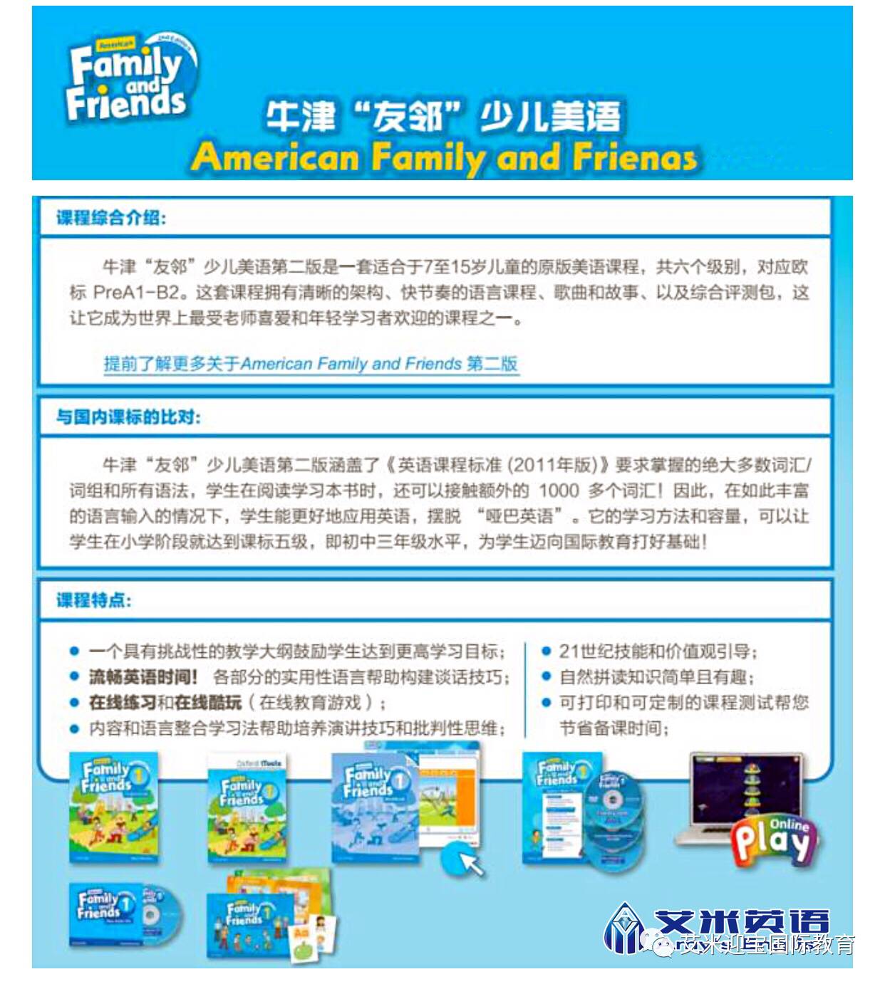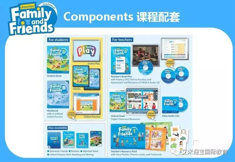 艾米迎宝国际教育携手北京迪格教育引进牛津大学American Family and Friends(友邻)系列高端少儿美语教程。涵盖了中国《英语课程标准》,6个级别的教程让学生轻松学会英语课标要求的1,600个核心词汇、词组和65项语法句型,更可在阅读中接触额外的1,000多个词汇。该系列教材的学习方法和容量,可以让学生在小学阶段就达到课标五级,即初中三年级水平,为学生迈向国际教育打好基础!研究表明:当知识需求、社会需求和情感需求全面得到满足时,学生能发挥出最佳的学习能力。牛津“友邻”少儿美语就是根据这一特点,为儿童量身设计,帮助儿童全方位发展。