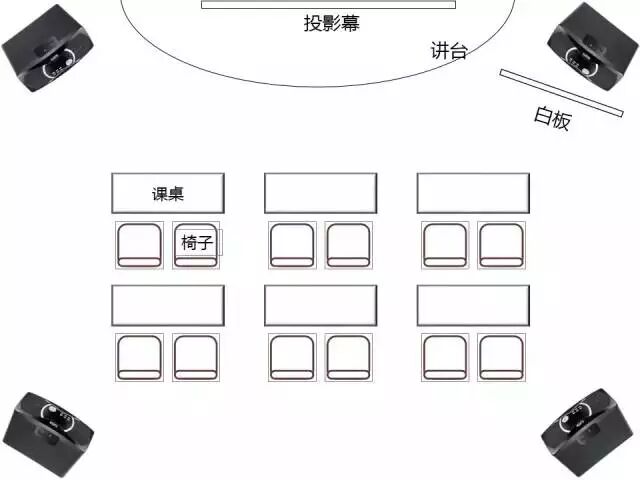 如果有可能,强烈建议音箱在教室四个角各有一个,这样讲师的声音,不管是前排第一个人,还是后排第一个人,还是中间的人,听到的效果就是相差不大的。