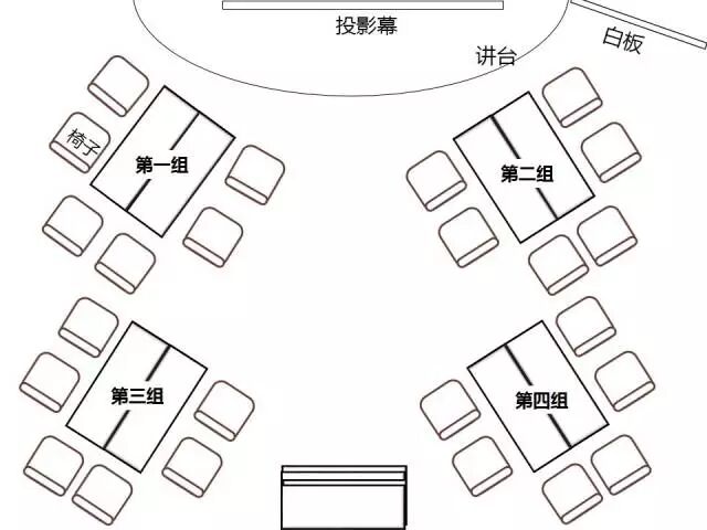 当然,随着授课目的不同,想要达到的课堂效果不同,桌椅在摆放模式上还有其他的方式,课堂中讲师可以根据需要,让学员摆放成各种模式。