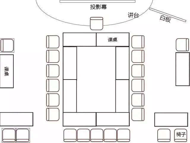 等到工作之后,我们接触到的学习教室,通常情况都是会议室,还是以上教室,如果我们开会,就可以摆成以下样子: