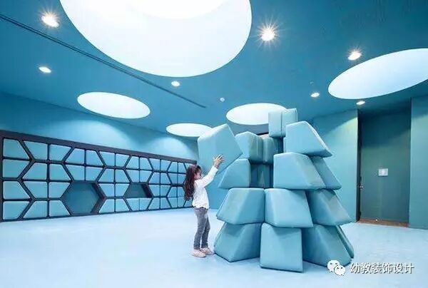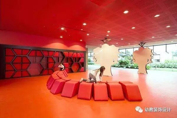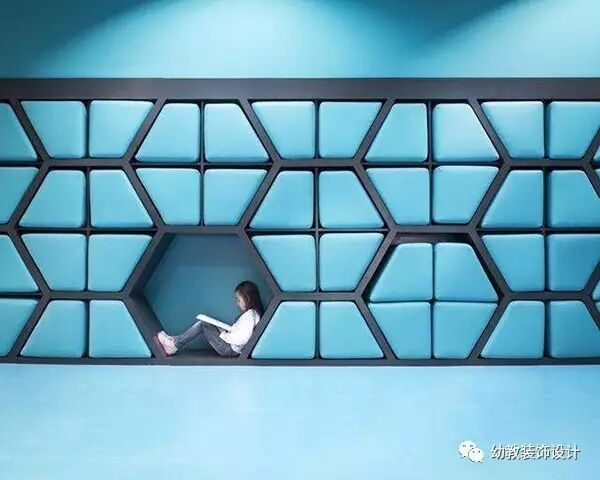 墙壁上安放座垫的几何格子可以作为孩子们的阅读空间