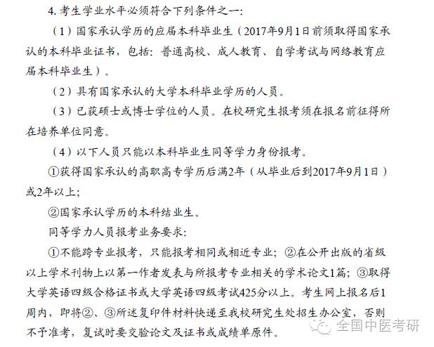 1.我校中医硕士专业学位(含中医学、中西医结合临床等专业,专业代码以1057开头)只接受符合中医医师资格考试报考条件规定的专业要求的中医学、针灸推拿学、中西医临床医学等专业应届或往届本科毕业生报考。