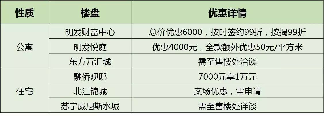 楼市冷淡之风盛行,江北首先坐不住了,近期共有6家楼盘纷纷给出购房优惠,其中有3家是住宅项目,另外3家为公寓项目。不过,这6家楼盘中,融侨观邸、明发财富中心和明发悦庭都是给出了明确的购房优惠。北江锦城、苏宁威尼斯水城、东方万汇城的优惠政策却是雾里看花,并未向外公开。从已公布的楼盘优惠来看,促销力度并不大,对购房者的吸引有限。
