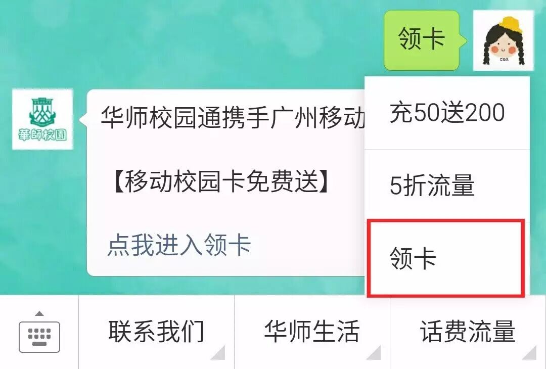 点击菜单栏或者回复“领卡”进入相关页面即可完成充值
