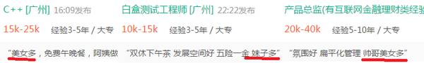 第三个截图更可怕了,贵司要招聘产品总监,竟然职业亮点是“帅哥美女多”——我擦咧,我一个月都赚40k了,我一个总监,我犯得上来你们公司勾搭妹子,真的不是职场性骚扰嘛?