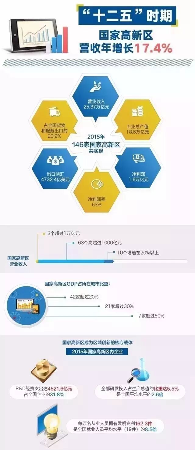 “十二五”期间,国家高新区营业收入年均增长17.4%(2011-2015年,中国GDP增速分别是9.3%、7.65%、7.67%、7.4%和6.9%)。2015年,146家国家高新区共实现营业收入25.37万亿元,工业总产值18.6万亿元,净利润1.6万亿元,净利润率达63%。国家高新区2015年出口创汇4732.4亿美元,占全国货物和服务出口的20.9%。
