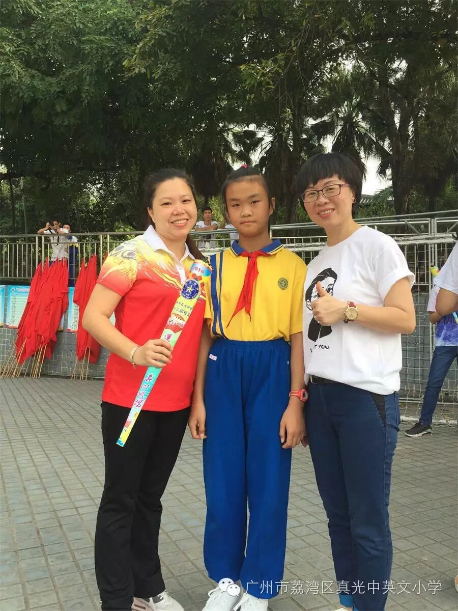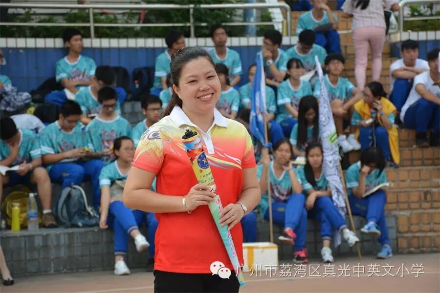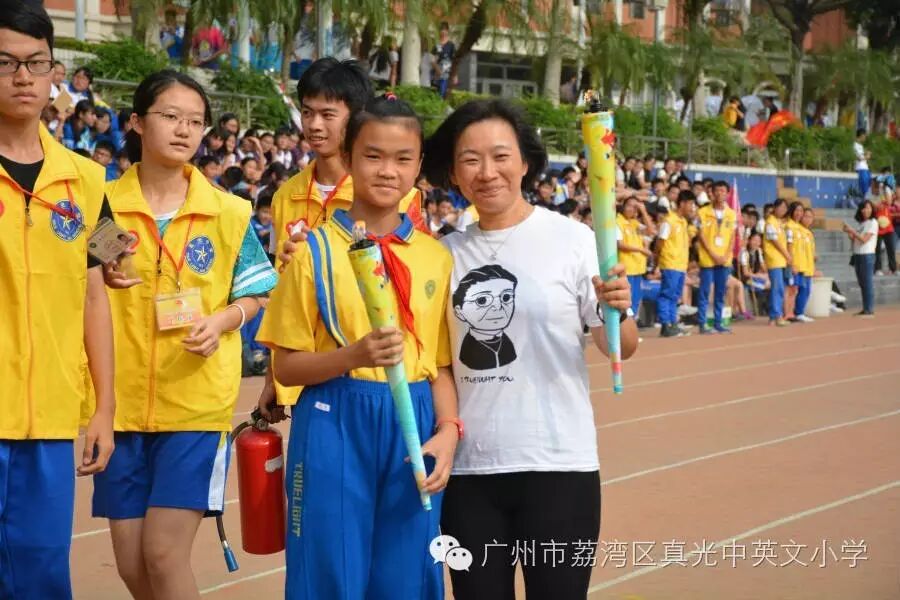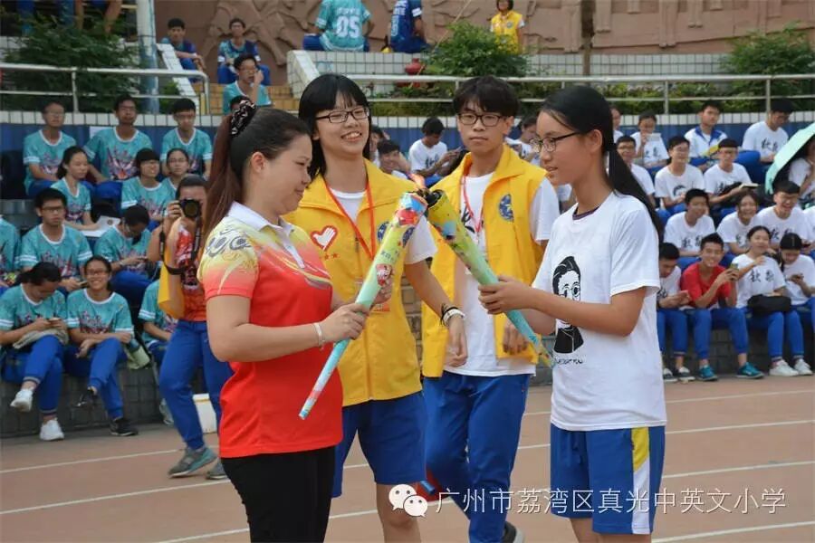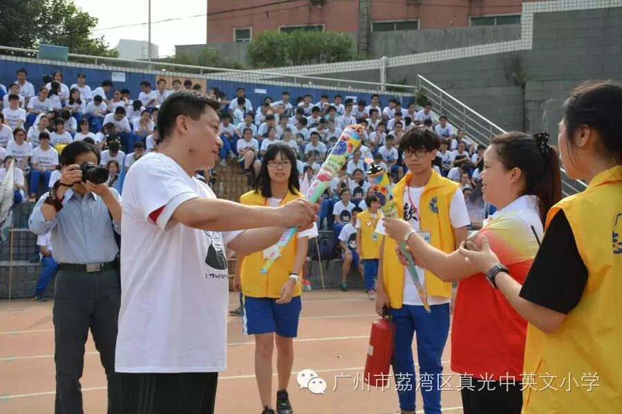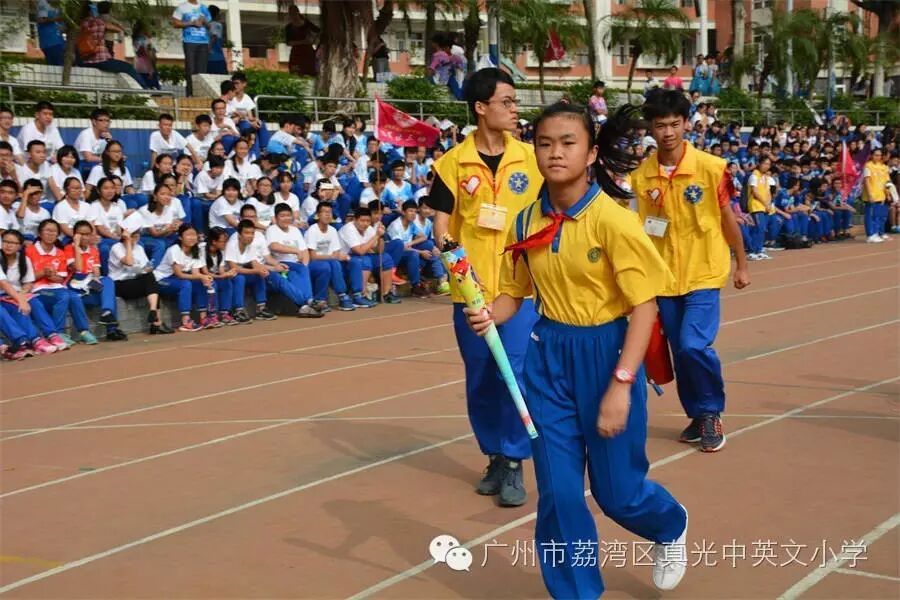 开幕式的高潮是真光特有的火炬传递仪式,学校每年都邀请来自各校区的学生、教师代表和校友代表进行的火炬传递,象征着真光精神薪火相传。今年德育处谭燕妮主任和六年(4)班陈蔓同学作为小学师生代表参与火炬传递。最后由真光中学双节棍社团点燃火炬台,把整个开幕式推向高潮。紧接着的真光特色跑旗活动,使整个赛场沸腾如火。