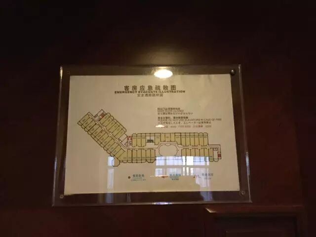 每个客房门后贴着紧急逃生地图,衣柜下都配备应急电筒及火灾逃生面具。