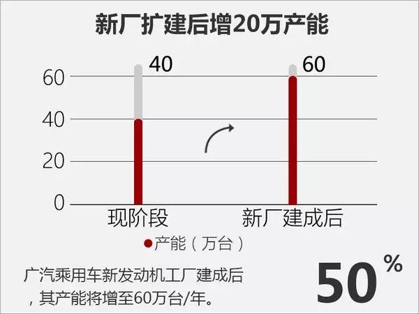 广汽乘用车发动机工厂扩建项目斥资5.77亿元,计划今年12月正式投产。新厂由现有厂区北部“发动机车间1”和“发动机车间2”通过调整布局,使生产线产能新增20万台/年。建成后,发动机工厂产能将提升至60万台/年。新工厂扩建后将投产7款发动机,包括5款搭载传统燃油车型的发动机和2款专用于新能源车型的发动机,其中含广汽自主研发的1.0TGDI三缸发动机。