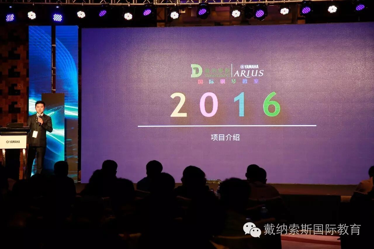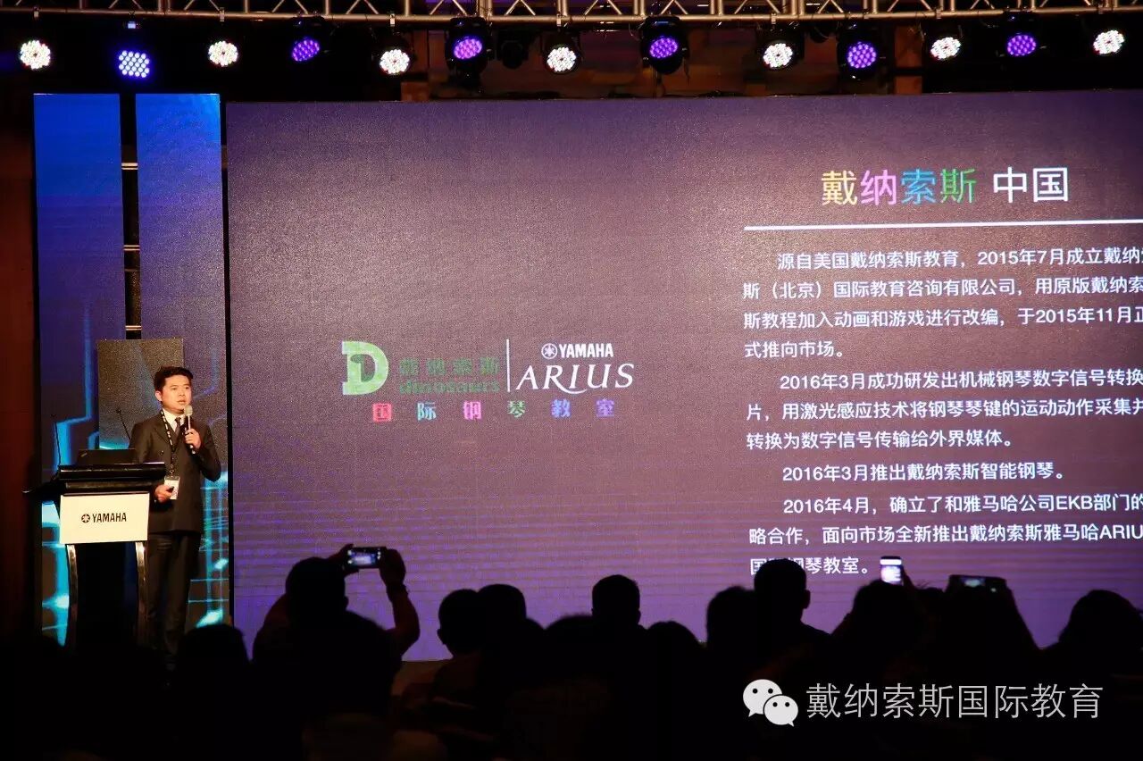 戴纳索斯(北京)国际教育咨询有限公司总经理陈文斌先生,代表戴纳索斯公司前往广州海航威斯汀酒店,参加2016年雅马哈电子键盘乐器全国星级经销商大会。作为项目介绍代表人面向全国星级经销商介绍"戴纳索斯雅马哈ARIUS音乐教室"。