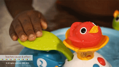 叶子下面有一道斜下来的小水柱,小水柱的猛的冲击使水流顺时间方向旋转,漂浮上面的小鸭子也随着水流旋转起来。宝爸宝妈也可以跟宝宝讲解力的原理:由于水的流入,从而引起水管喷水、力的旋转……让孩子体会到正确的物理学知识,通过游戏鼓励孩子去探索和发现更多生活的乐趣。