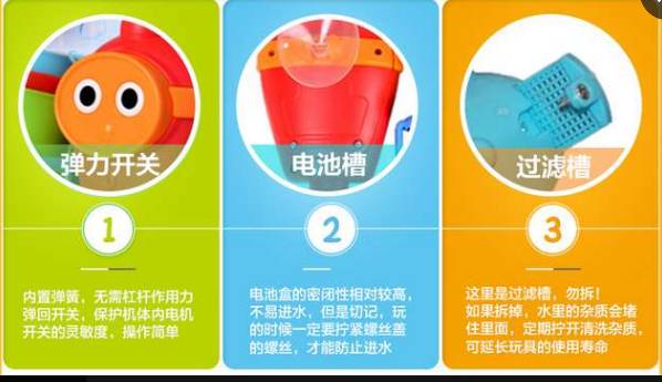 这个品牌最牛的地方就是它的设计,他们是全球首家引入电动洗澡玩具的厂家,电动的部分可以完全泡在水里的,我用了这么久,完全没有进水哦。这部分看起来结构很简单,但确是yookidoo称霸戏水玩具界的秘诀之一,目前为止其他厂家根本没有办法模仿。