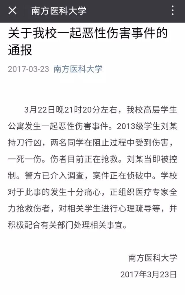 南方医科大学一学生持刀行凶,两名同学一死一伤。