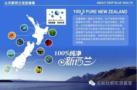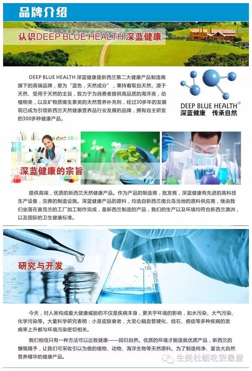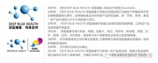 1990年,DEEP BLUE HEALTH深蓝健康公司确立采用新西兰当地生产种植的纯天然动植物提取物作为原料,自然辅助食品为导向的产品研发战略,将“天然、纯净、高效”的产品价值核心作为公司的奋斗目标。