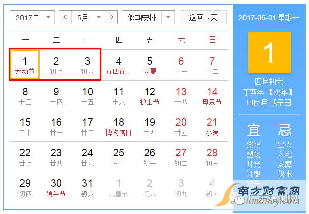 2017年5月28日至5月30日放假公休,共3天