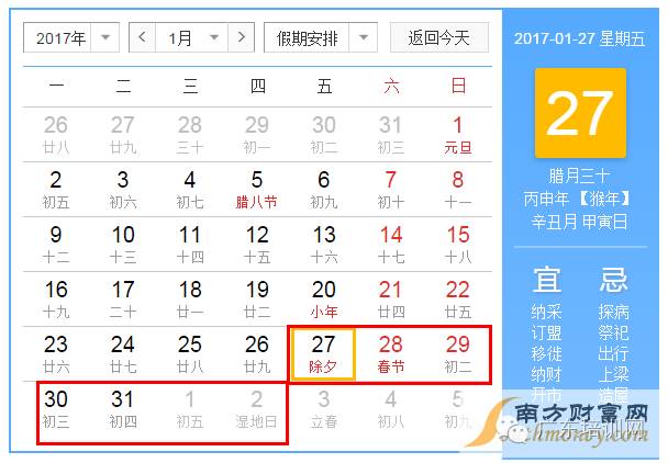 1月27日(星期五,农历除夕)、1月28日(星期六,农历正月初一)、1月29日(星期日,农历正月初二)为法定节假日