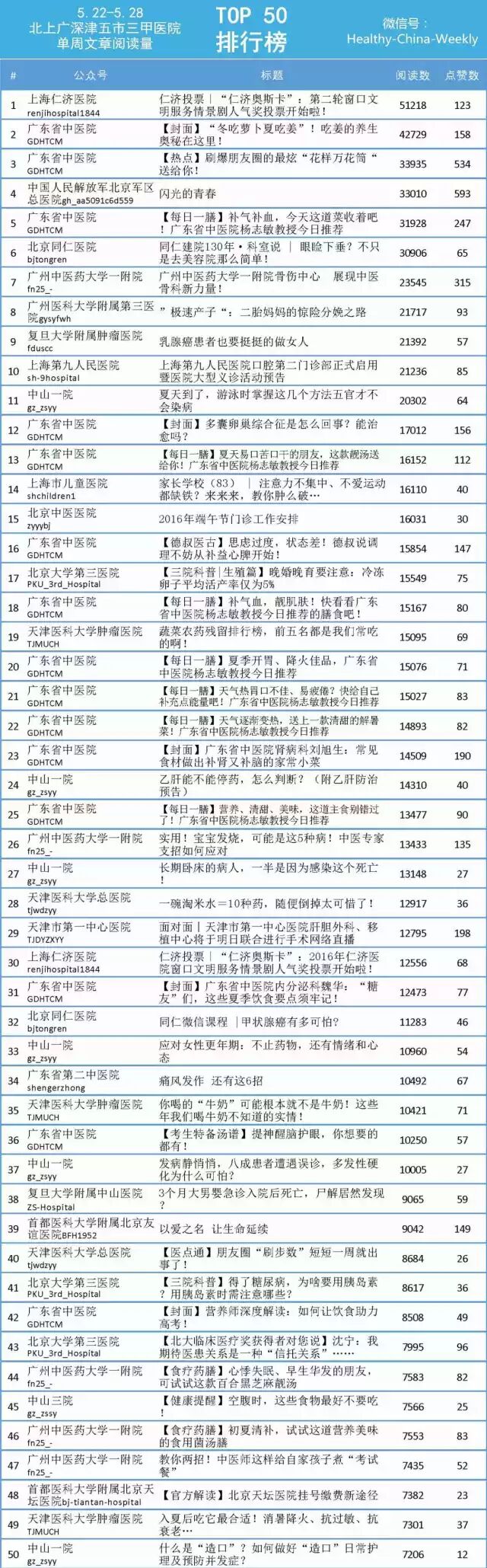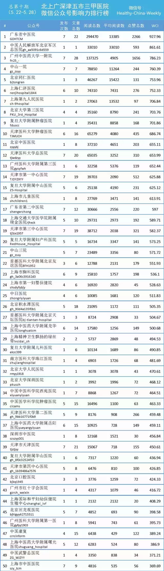 北上广深津三甲医院微信公号排行榜(5.22-5.28)