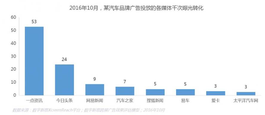 2016年10月某汽车广告投放各媒体千次曝光转化(数据来源:数字新思)
