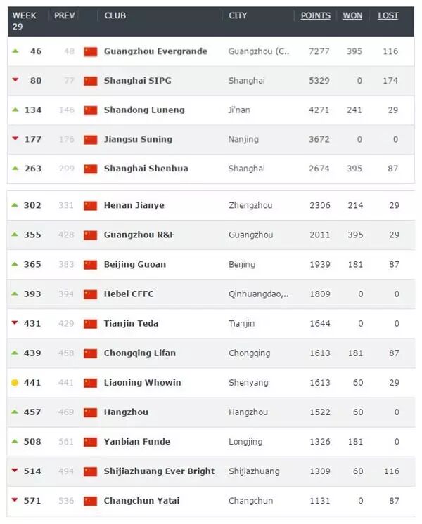 【导读】荷兰足球教练统计学院(IFCStat)通过旗下网站clubworldranking公布了2016年第29期的世界足球俱乐部排名。目前在中超积分榜上以13分的巨大优势领先的广州恒大淘宝总名次再提升两位,最新排名为46位。上海上港和江苏苏宁则都小幅下滑,近期成绩回暖的山东鲁能泰山依然位列中超俱乐部榜的第三位,并且总排名也提升12位,最新排名位列第134名。