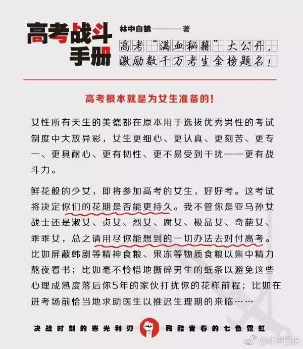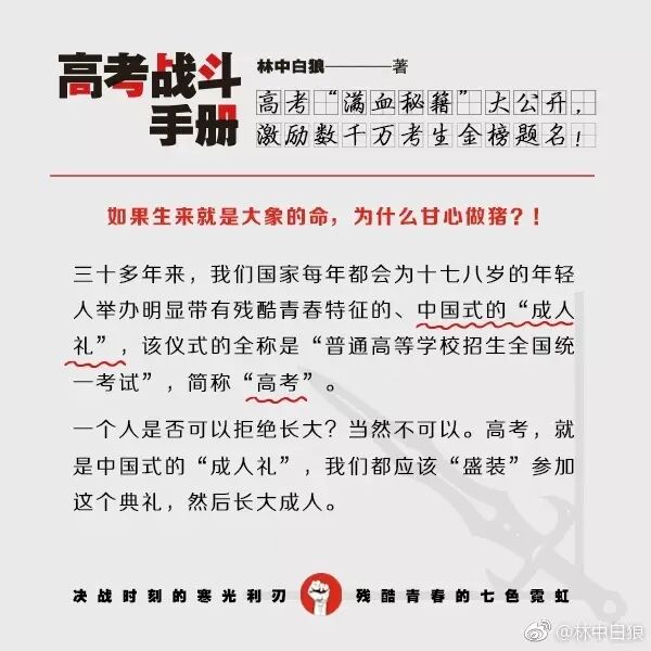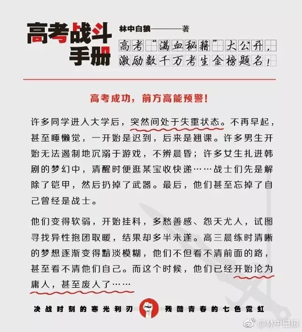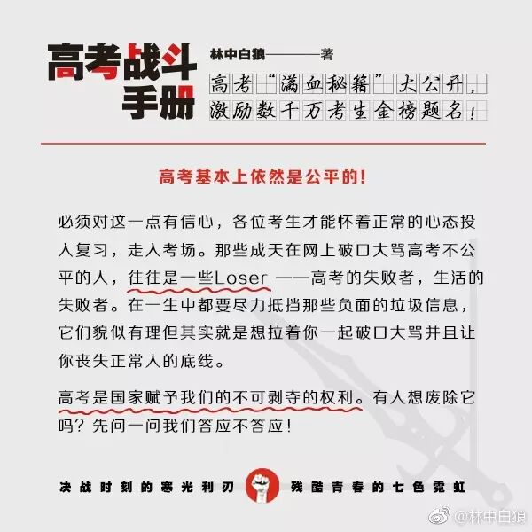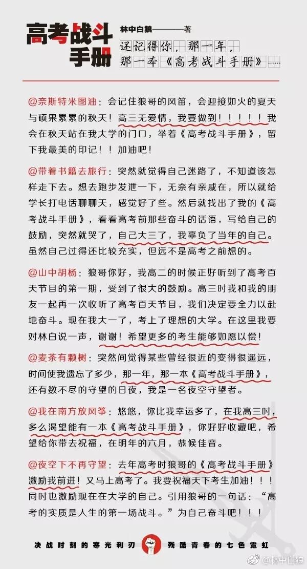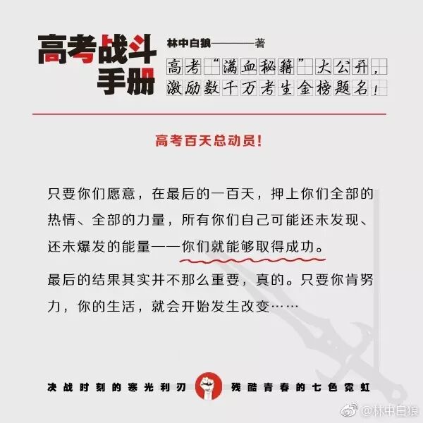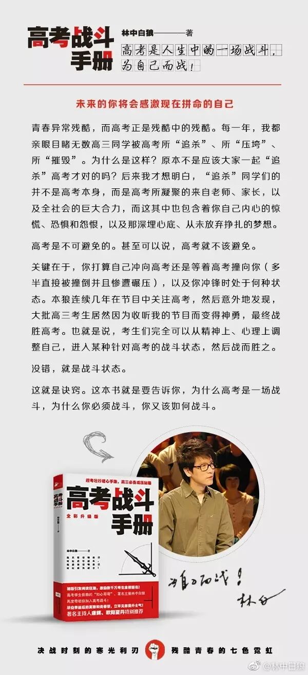 【高考倒计时70天】各位高三同学,大家都已经进入“战斗冲刺状态”了吗?本狼的 #高考战斗手册# 全新彩色版也已经上市了,各位可以翻开“高考百天总动员”一章,里面有我与天下学子的约定:苟上位,必发声,与子偕行!在最后的冲刺阶段,押上你们全部的热情、全部的力量,像个战士一样去面对、去战斗!来证明一下你还年轻!来证明一下你还有梦想!来证明一下你还能够爆发!愿《高考战斗手册》与你们相伴,直至走进理想中的殿堂。