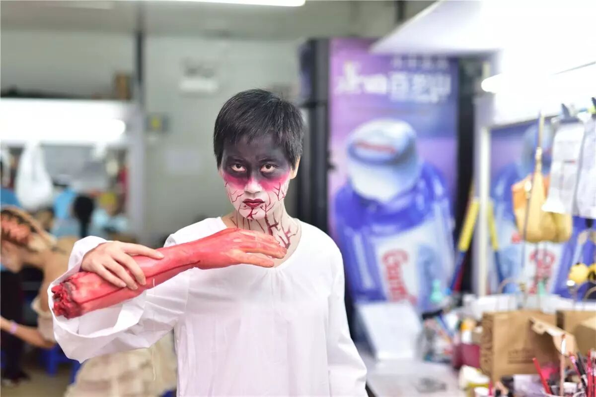 长隆的万圣节造型团队技术一流,为了画这个妆也是拼了,脑门大片阴影涂了好久好久好久……每一滴血淌的角度都画得很仔细。