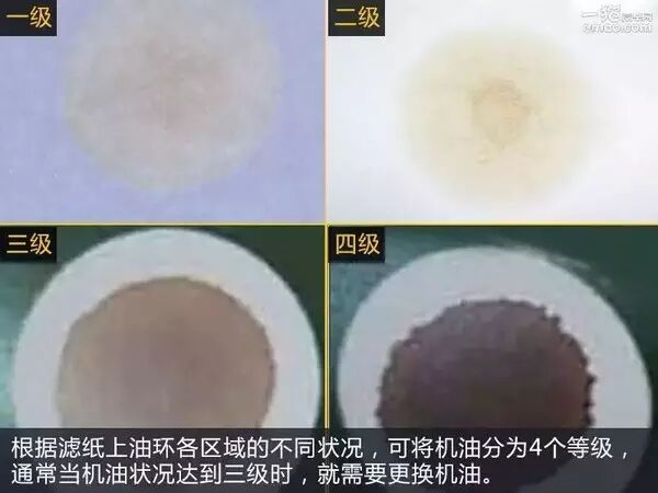 当斑点试验的油环状态达到三级的标准,需更换机油。一般来说,轿车的机油是较难出现三级这样的状况的,如以出现三级的状况则表示机油品质已经劣化严重,建议车主在沉积环以及扩散环颜色已较深伴,扩散环已变窄的时候更换润滑油。这样能较好地节省费用,也对延长发动机寿命有所帮助。