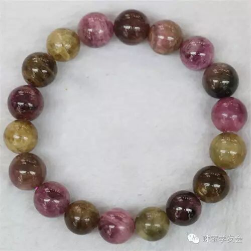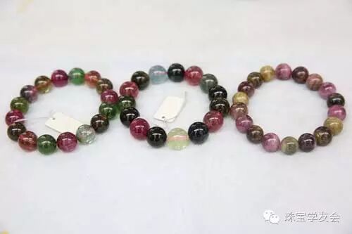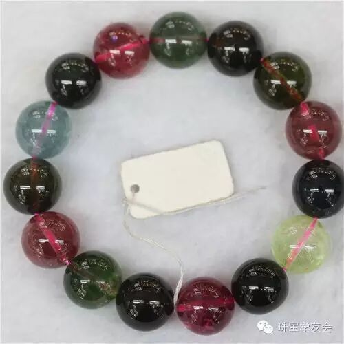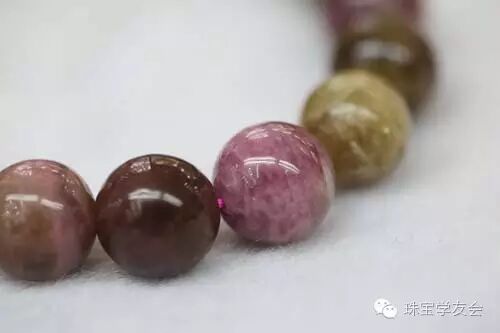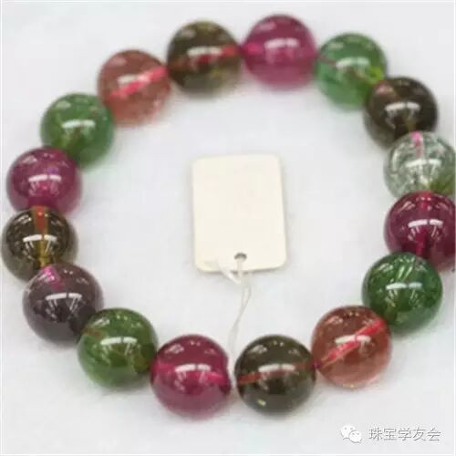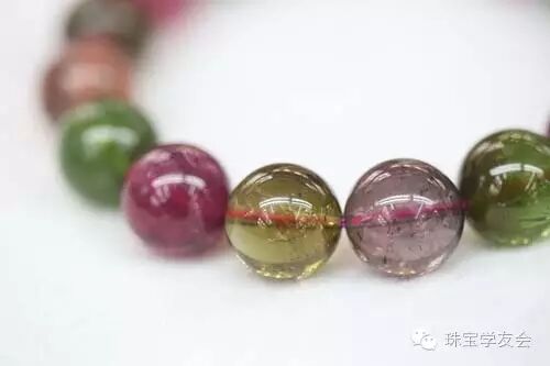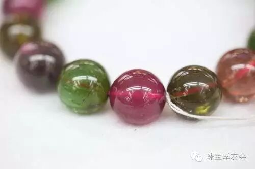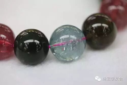 这是上图中最左边的那一条,碧玺所选用的颜色十分鲜艳,而且丰富多样。其中还有四颗卢比来色(粉红色)的碧玺,这个颜色在碧玺中有着特殊的地位。