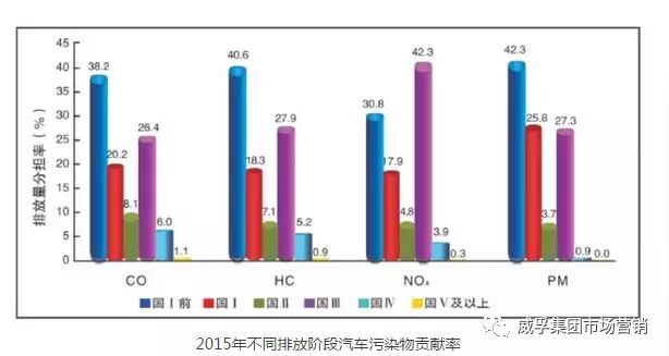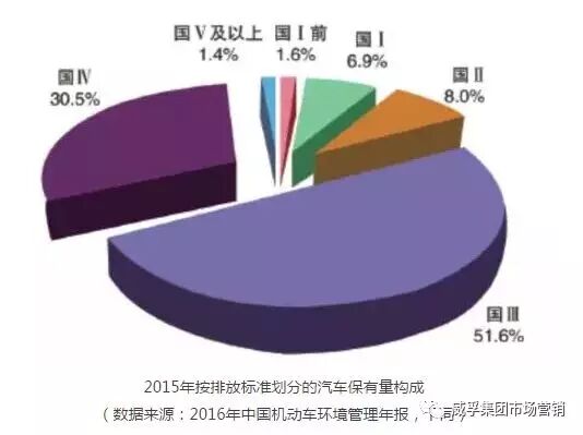 2015年全国汽车保有量中,国一前标准的汽车257.8万辆,国一标准汽车1118.8万辆,国二标准汽车1301.1万辆,国三标准汽车8338.5万辆,国四标准汽车4927.3万辆,国五标准汽车226.2万辆,分别占总保有量的1.6%、6.9%、8.0%、51.6%、30.5%、1.4%。需要重点关注的是国一前标准的汽车,其排放一氧化碳1150.7万吨、碳氢化合物145.6万吨、氮氧化物166.1万吨、颗粒物22.8万吨,占汽车总排放量的38.2%、40.6%、30.8%、42.3%。这部分车全部属于黄标车的范畴,保有量小但排放量占比巨大,因此国家出台淘汰高排放黄标车政策就是要在影响最小的情况下获得最大的环境效益。