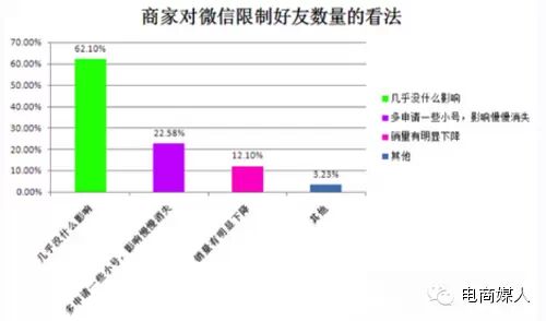 微信对好友数的限制,就是上有政策下有对策,真正用心的商家,还是能想到多增加个人微信号数,或者求精准而不求多的方式进行加好友,甚至是做一些减法(将非目标人群删除)等方式,避免政策对销售额的影响