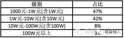 绝大部分商家的流水还很少,只有11%的人流水过10w,过百万的更是只有3%