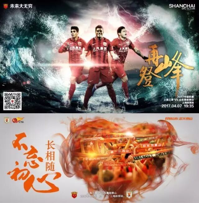 本周末,中超第4轮8场战事火辣开战,本轮,排名前四的球队捉对厮杀,两场强强对话无疑会吸引球迷的强烈关注。一场是上海上港与山东鲁能之间的对决,另外一场就是广州德比之间的较量,各俱乐部也相继发出对战海报。