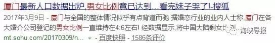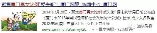 :早在2013年底,厦门户籍人口中,女性比男性多了11900人(性别比为98.8);而2010年、2011年、2012年厦门性别比分别为100.18、99.5、99.1,愈演愈烈!