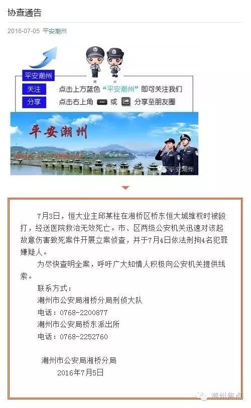 潮州警方依法刑拘4名涉嫌恒大业主邱某柱被故意伤害致死案件的犯罪嫌疑人