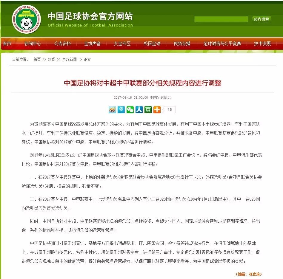 今天上午,中国足协在官网发布《中国足协将对中超中甲联赛部分相关规程内容进行调整》的公告,之前广泛流传的、对中超各队影响重大的外援及23岁以下球员的使用新政正式落地,并将于本赛季开始实施。
