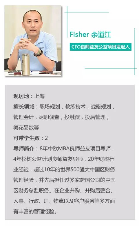 导师来自上海、北京、南京、广州、青岛、杭州、武汉等7个城市;是的,你没听错,以上正是CFO良师益友公益项目发起的“180天财税精英培养计划”,本次活动邀请了近百位CFO级导师参与公益指导,面向社会公开招募财务经理或主管级别财务人员,进行为期6个月的公益指导!无论你困惑是人生的迷茫,还是职业抉择,亦或者是具体的沟通管理等软技能的提升,CFO导师都可以结合他的经验和阅历给到你宝贵的建议!这些问题财税从业人员或多或少都可能遇到,埋头苦干而又苦苦摸索中,而一个经验丰富的前辈来指导则是可遇不可求的。导师帮助学生进行个人情况综合分析,确定初步职业目标;至少每月一次的线下会面,跟进执行进度以改进和完善目标;平台跟进师生沟通情况,给予师生沟通最大程度的支持;更多导师登录官网(www.cfo-mentor.com)查看步骤1:添加CFO良师益友官方小秘书微信号,提交个人资料信息;步骤2:登录官网注册并完善个人信息,承诺愿意将CFO良师益友公益之心进行传递,即可领取200元报名抵用券及3000元导师费抵用券,选择导师。PS:近百位CFO导师公开招募学生末班车来啦,戳阅读原文,了解更多活动详情并报名。