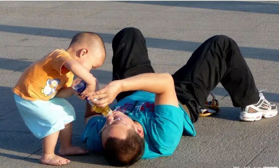 北京,一位幼童给躺在地上休息的爸爸喂水。