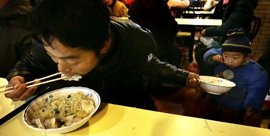 广州火车站附近的早餐摊点上,父亲一手夹面,一手为儿子端着面碗,两父子同时享用着热气腾腾的早餐。