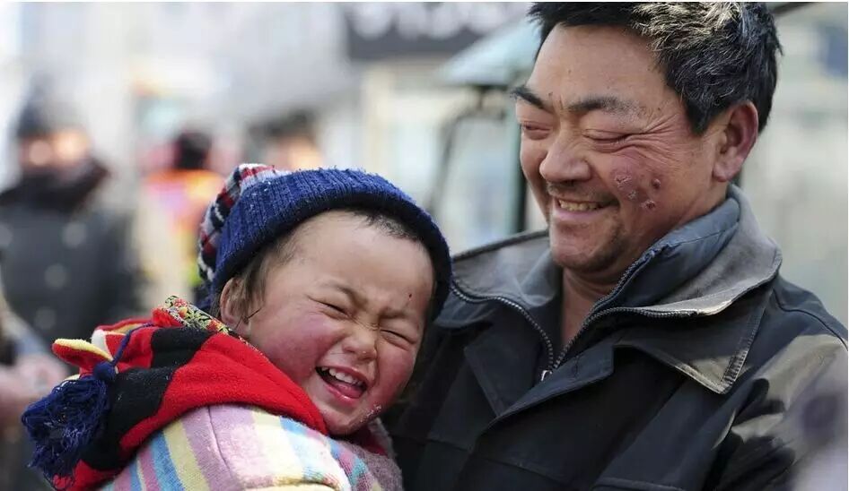 北京房山区,一位以开摩的为生的父亲紧紧抱着自己两岁的儿子。