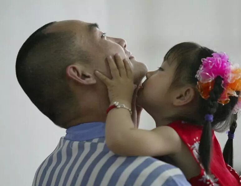 ,一位服刑人员的女儿亲吻父亲。